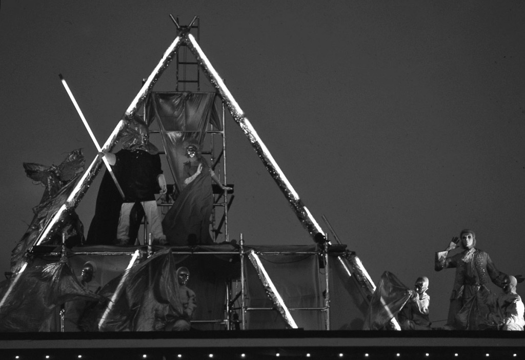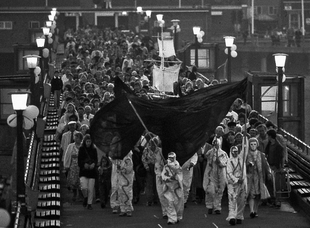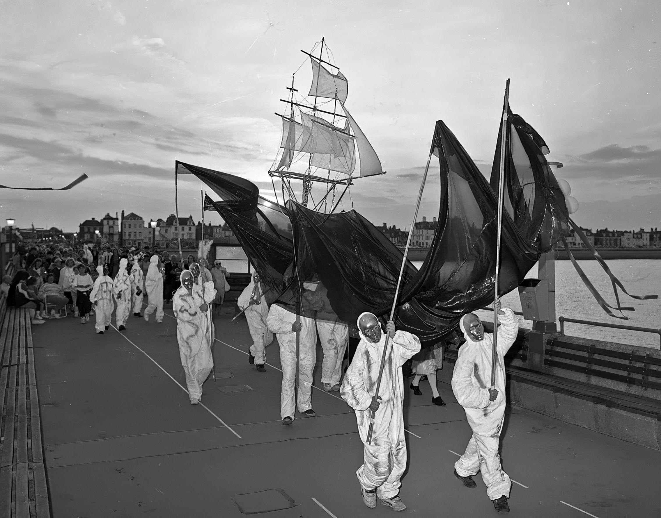 After four years of Shakespeare, it was time for a change. So, in 1991 there were two very different yet complementary productions: At Deal Castle, a play by Shakespeare’s contemporary Christopher Marlowe was staged: Doctor Faustus. And on Deal Pier, which had hosted the last night of A Midsummer Night’s Dream, a novel processional reimagining of The Tempest took place. Both used all the tropes, conceits and conventions that by now had become familiar every summer in Deal: community casting, amateur and professional actors, spectacular settings and costumes, music, song and dance, and a joyous, celebratory atmosphere.